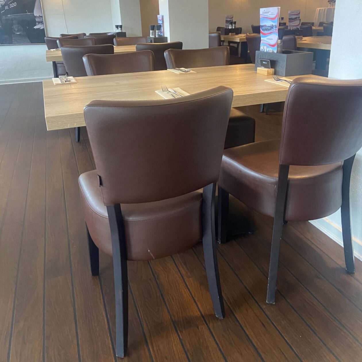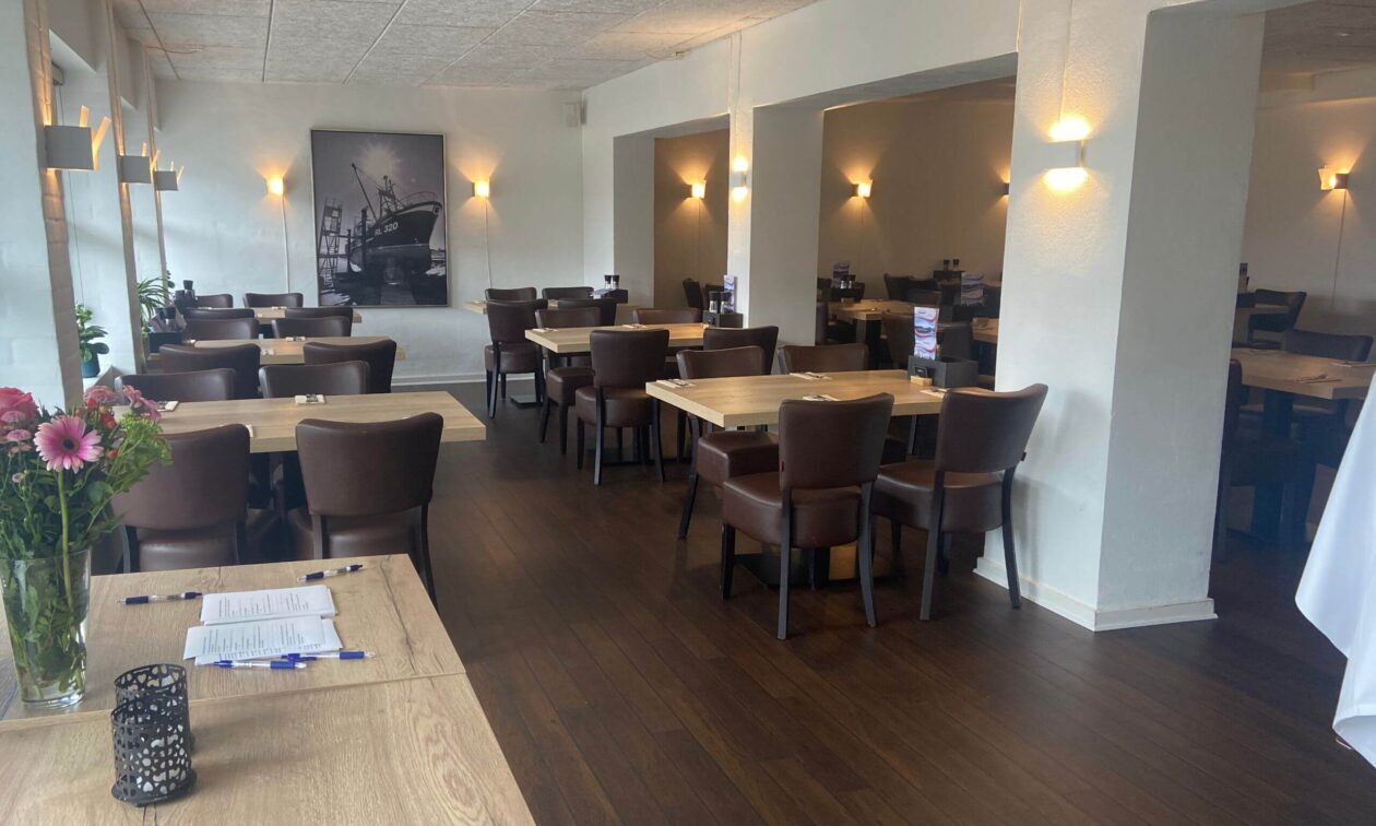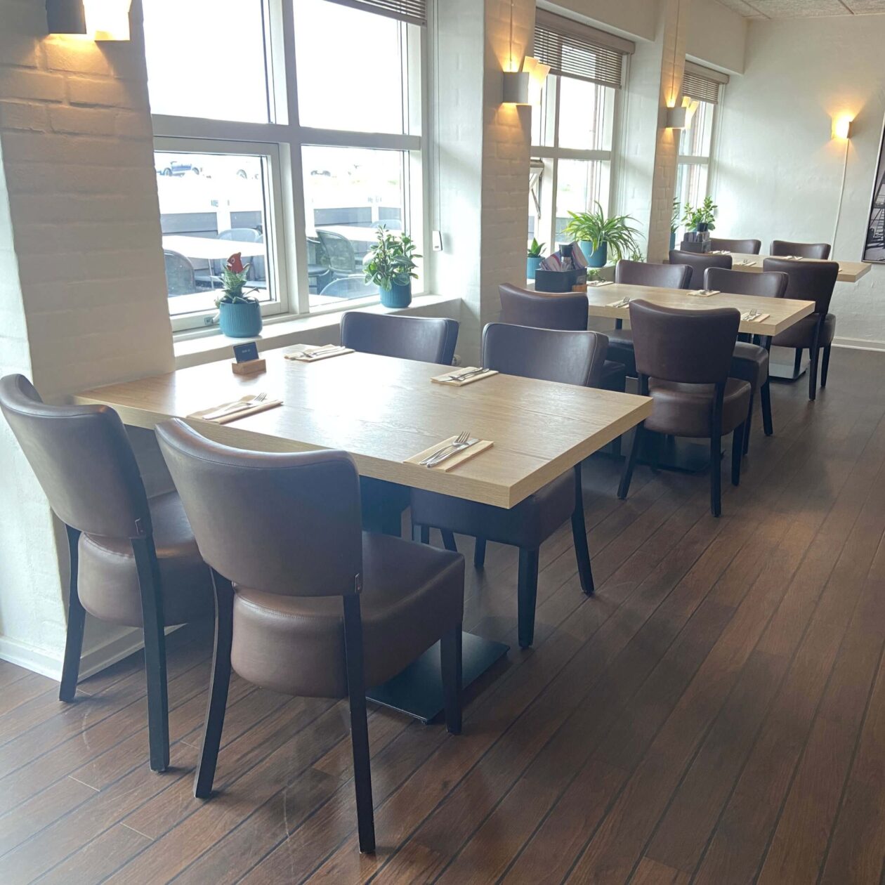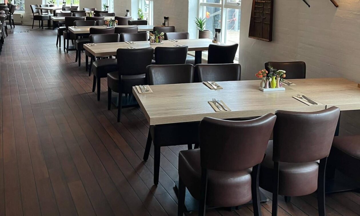 Hvide Sande Røgeri - Indendørs - fik leveret sofabænke efter specialmål og med eget valg af betræk. Der ud over fik de leveret Isabella stole i brun og laminatbordplader i egetræs look sammen med aiko bordstel.