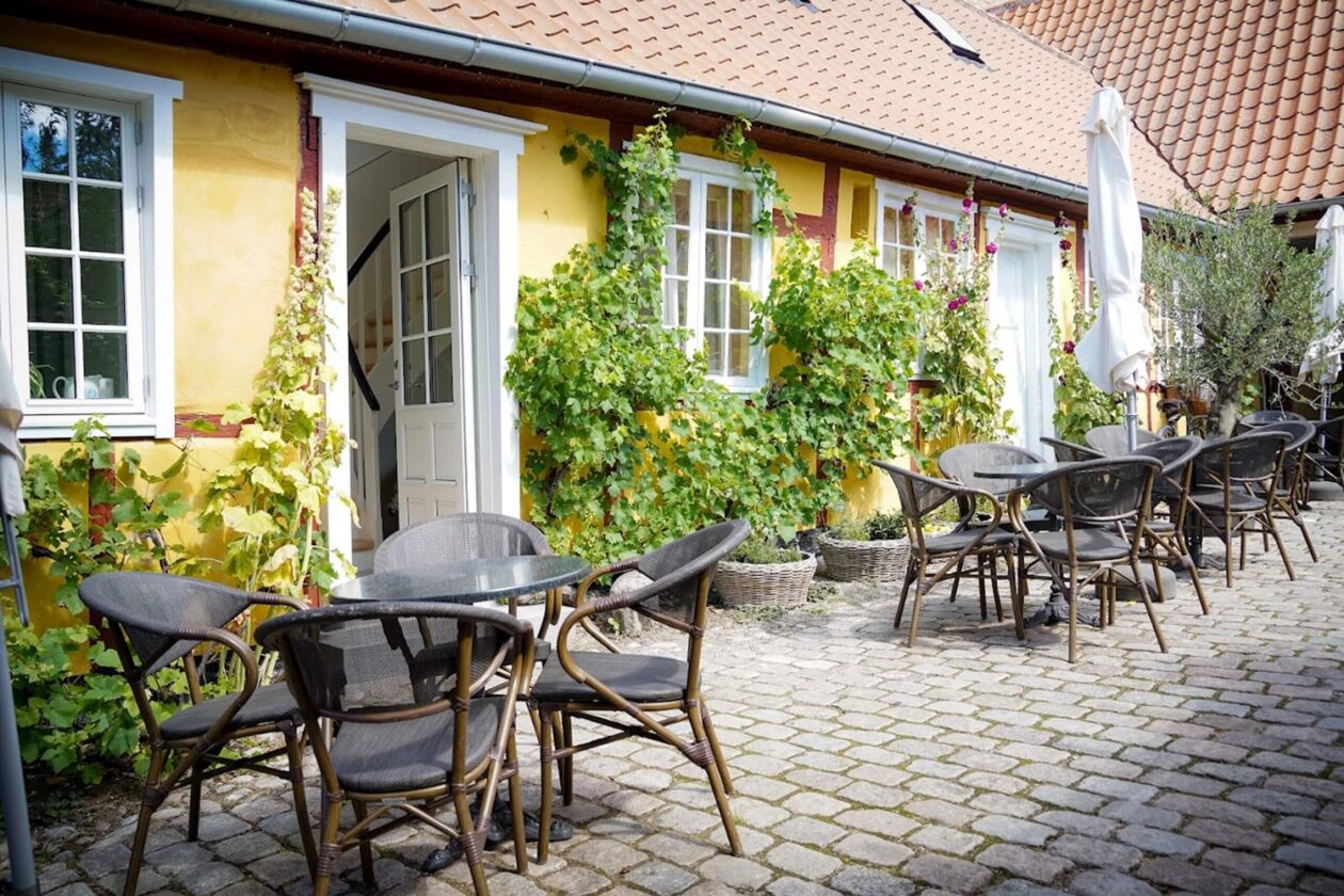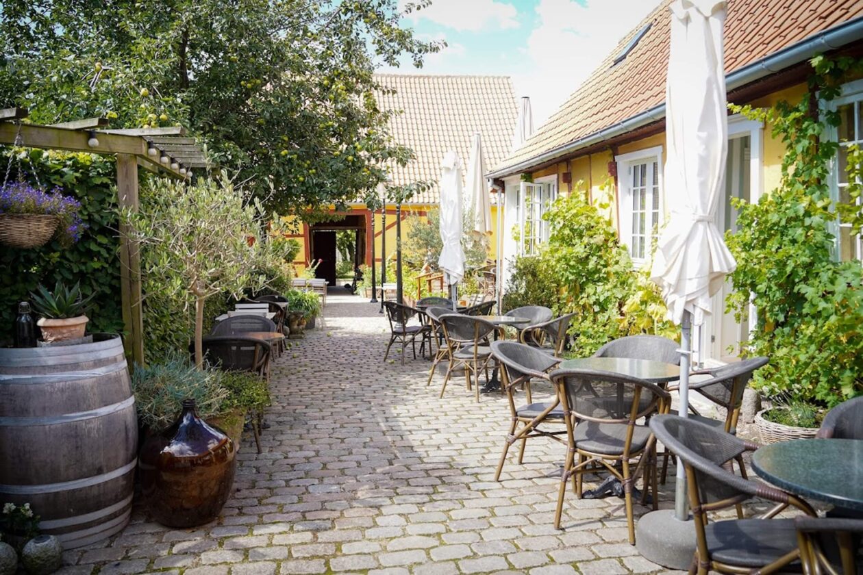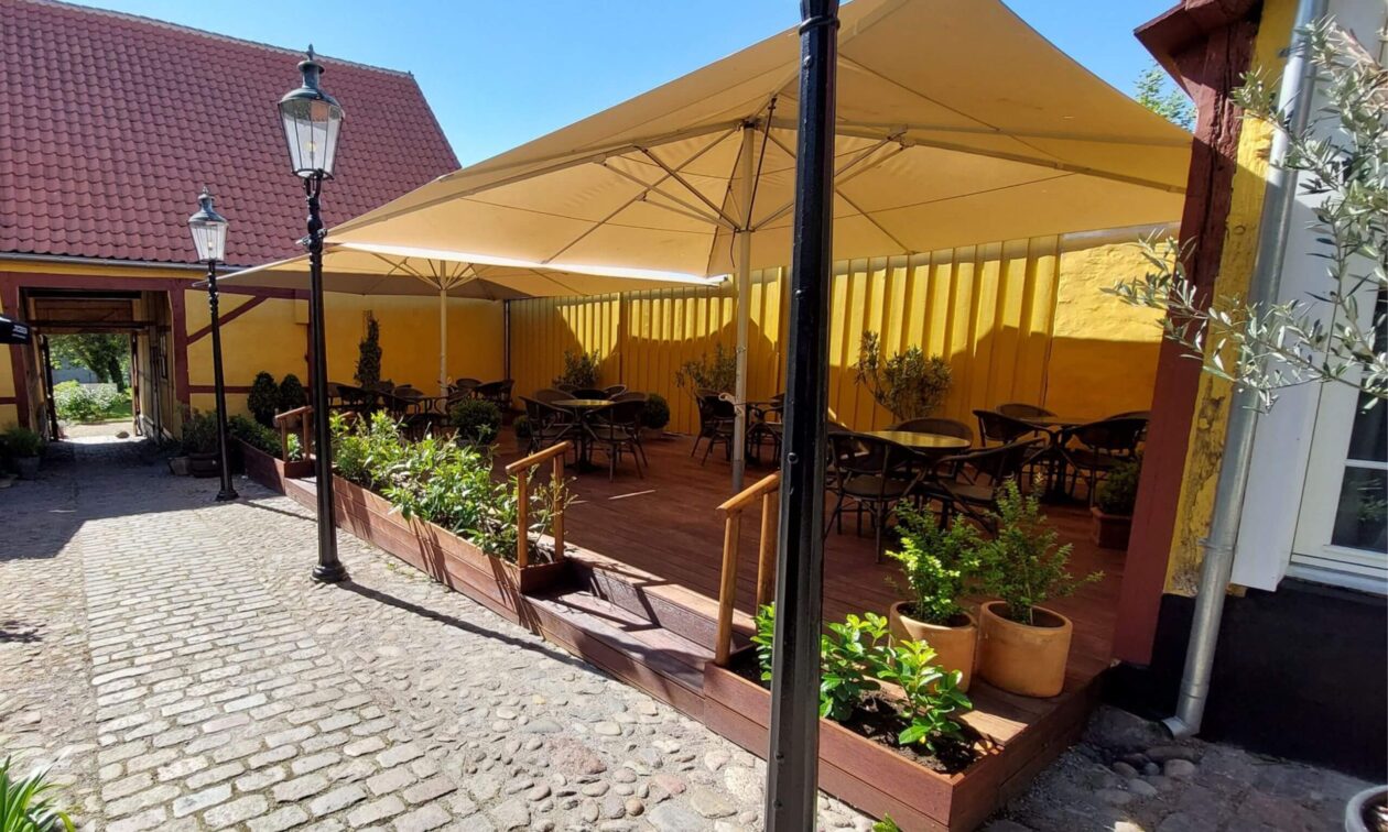 Hotel Møen - Stege kjøpte nye utemøbler til sin koselige uteplass. Valget falt på 'Cheri' brun/brun, Basalt bordplater i Ø70 og Løvefod 3 bordstativ.