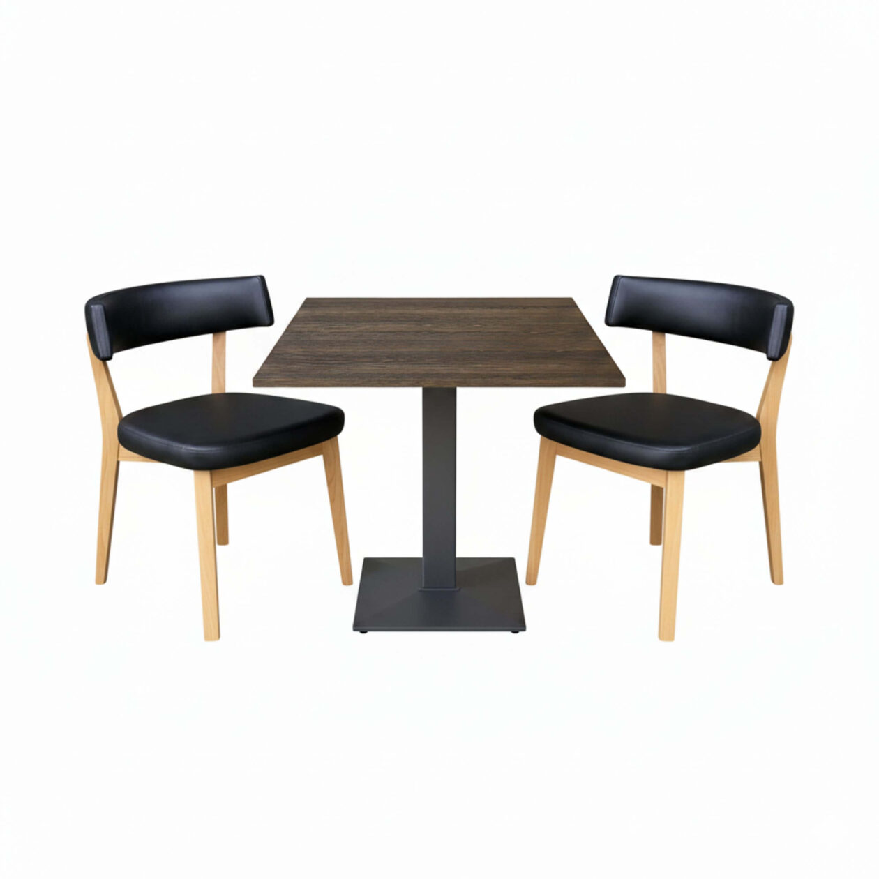 Kafésett 19 – 2 x Oliver-stoler i lys eik – 1 x Wengé-melaminbordplate 70×70 – Aiko-bordramme i svart
