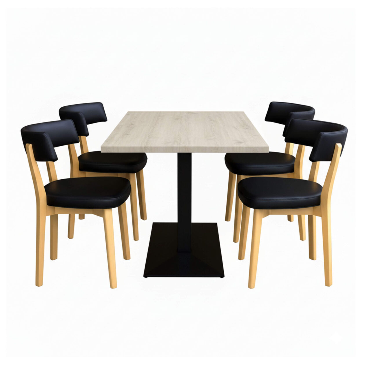 Kafésett 24 – 4 x Oliver-stoler i lys eik – 1 x bordplate i melamin med lys eik-look 70×120 – 1 x Aiko DB-bordstamme i svart