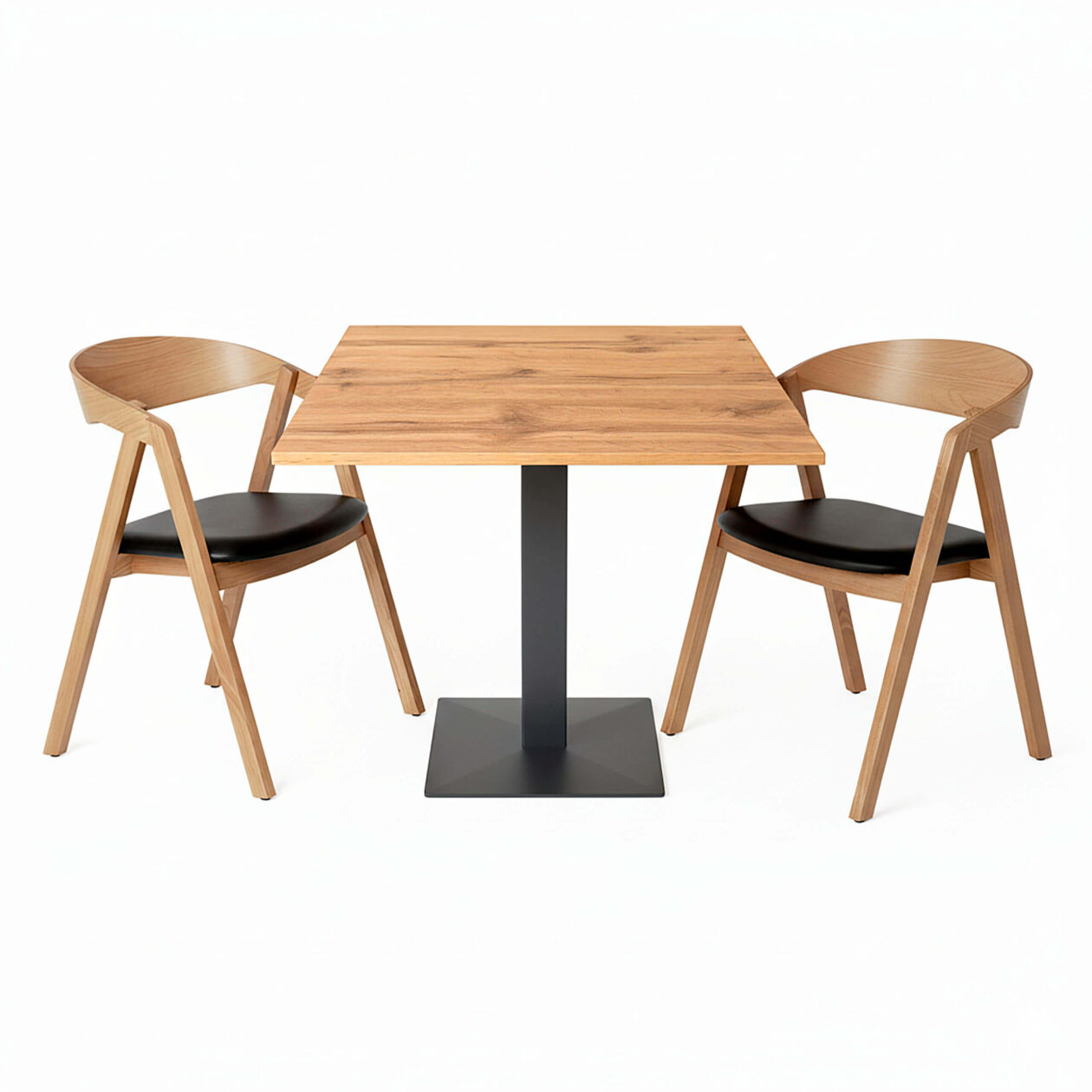Kafésett 26 – 2 x Selma eikestoler med sorte seter – 1 x Antikk eik melamin bordplate 70×70 – 1 x Aiko svart bordunderstell