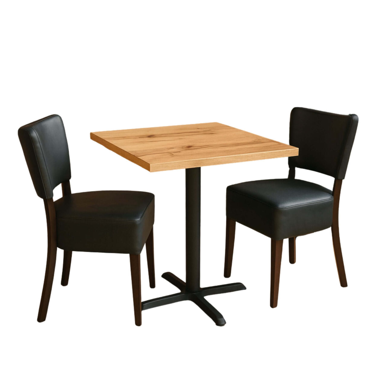 Startsida / Möbler / Inomhusmöbler / Café set / Caféset 2 - 2 svarta Isabella-stolar - bordsskiva i melamin av antik ek 70×70 - svart bordsstativ Gafa 4