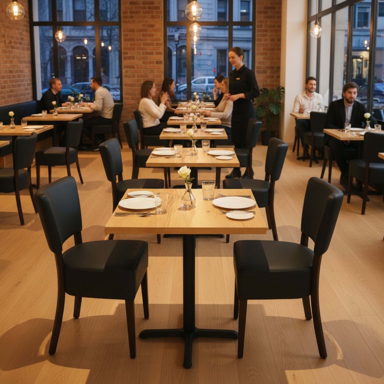 Med Café Set 2 - 2 Isabella svarta stolar - Antique Oak melamin bordsskiva 70×70 - Gafa 4 svart bordsunderrede får du en komplett lösning som kombinerar funktionalitet, kvalitet och design. Det är en möbelserie som både skapar en välkomnande atmosfär och säkerställer lång livslängd i en professionell miljö.