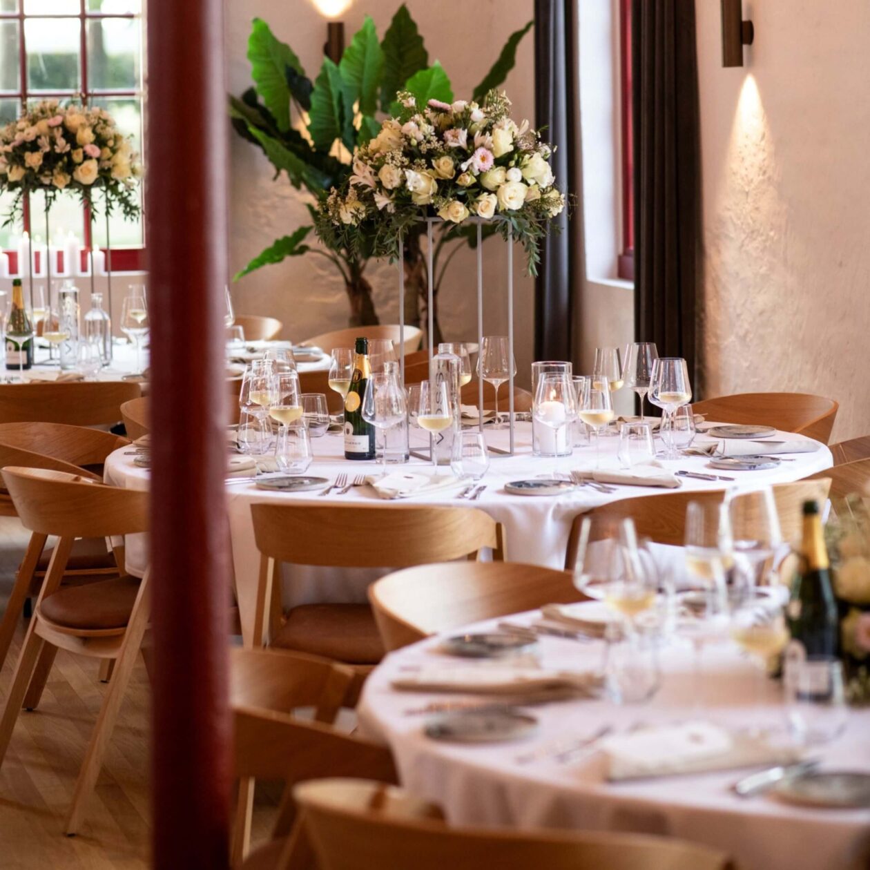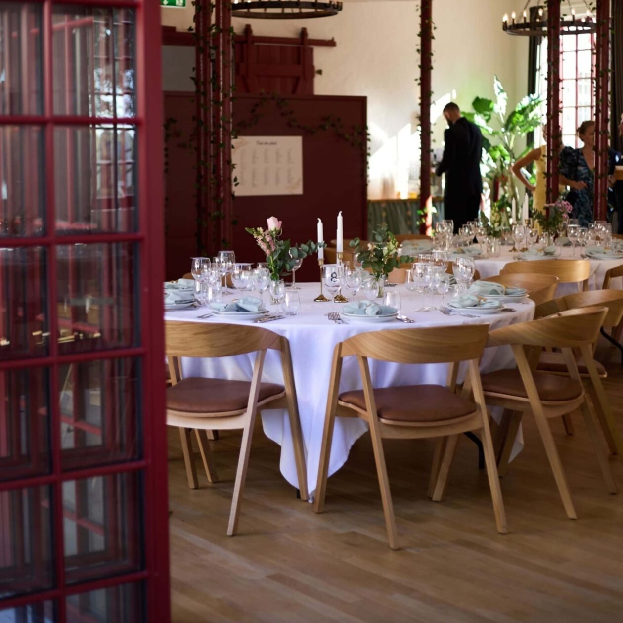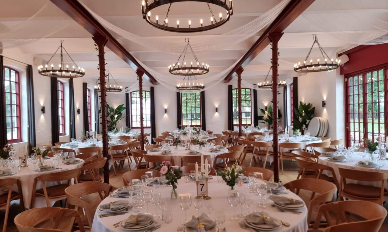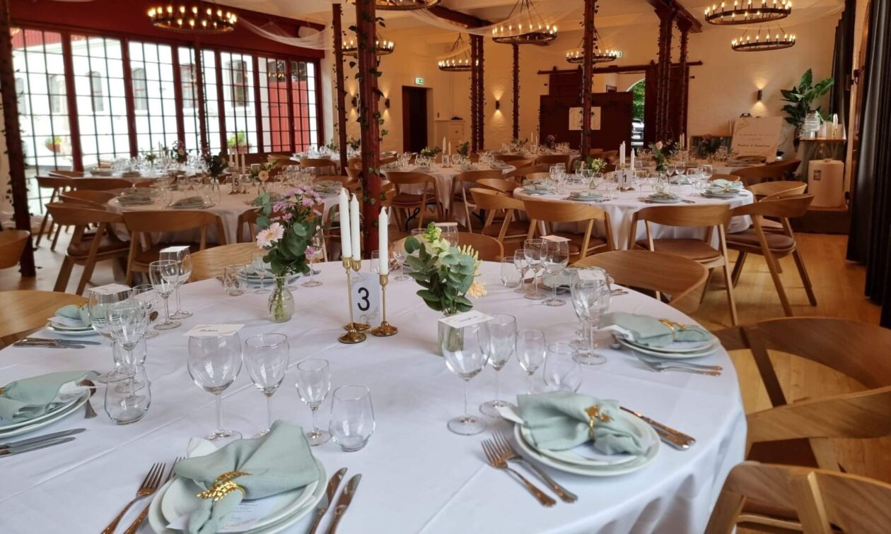 Hotel Nybogaard - Kvistgård har fått nya stolar till sitt stora rum. Valet föll på Simone-stolar i ek med cognacsfärgad klädsel på sitsen.
