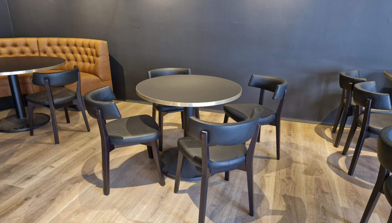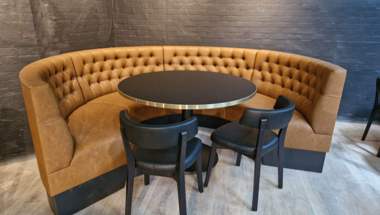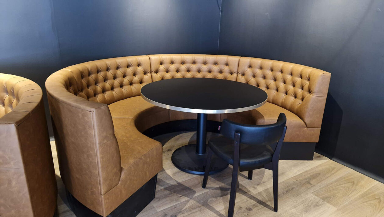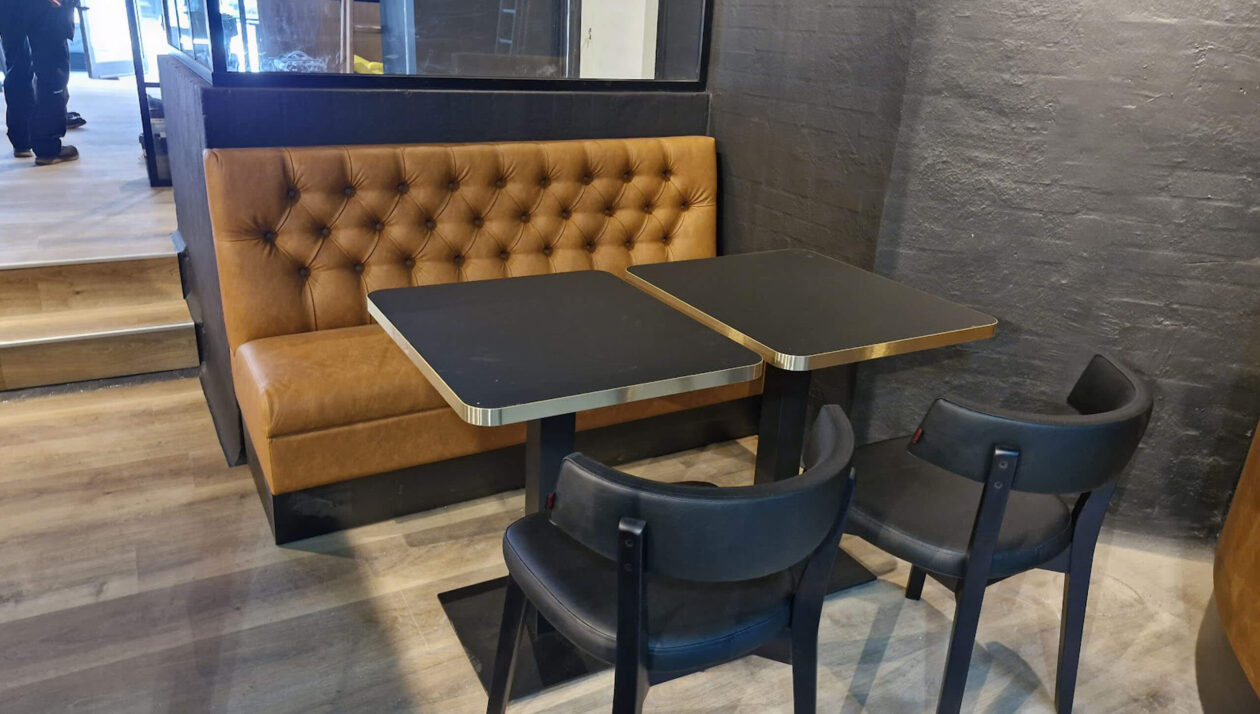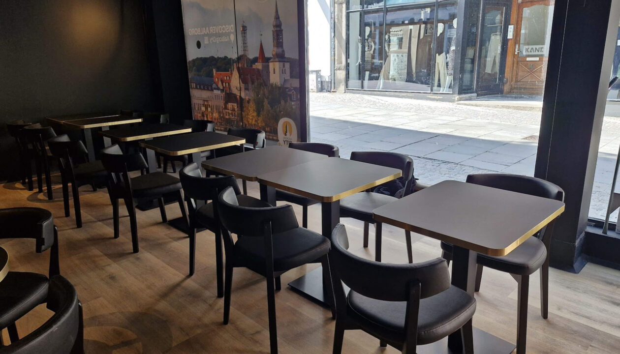 Kaffebaren - Aalborg har skräddarsytt kaffebänkar i chesterfield-look, stolen "Oliver" och vackra bordsskivor i Fenix med mässingskant. Resultatet är ett vackert och inbjudande utrymme - redo att välkomna sina kunder