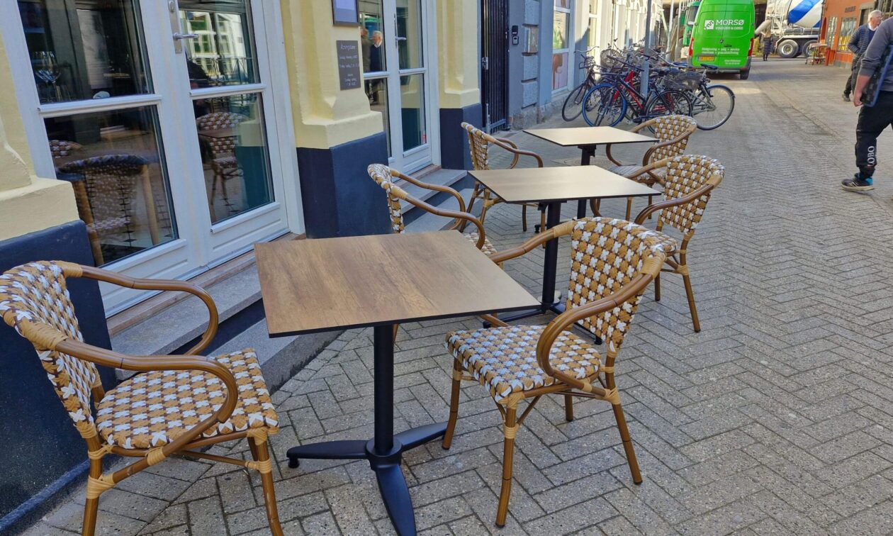 Restaurang SL - Odense har fått nya utemöbler. De köpte vår helt nya Tarte Brown/White och de läckra kompakta utomhusborden Canyon Monument Oak i laminat.