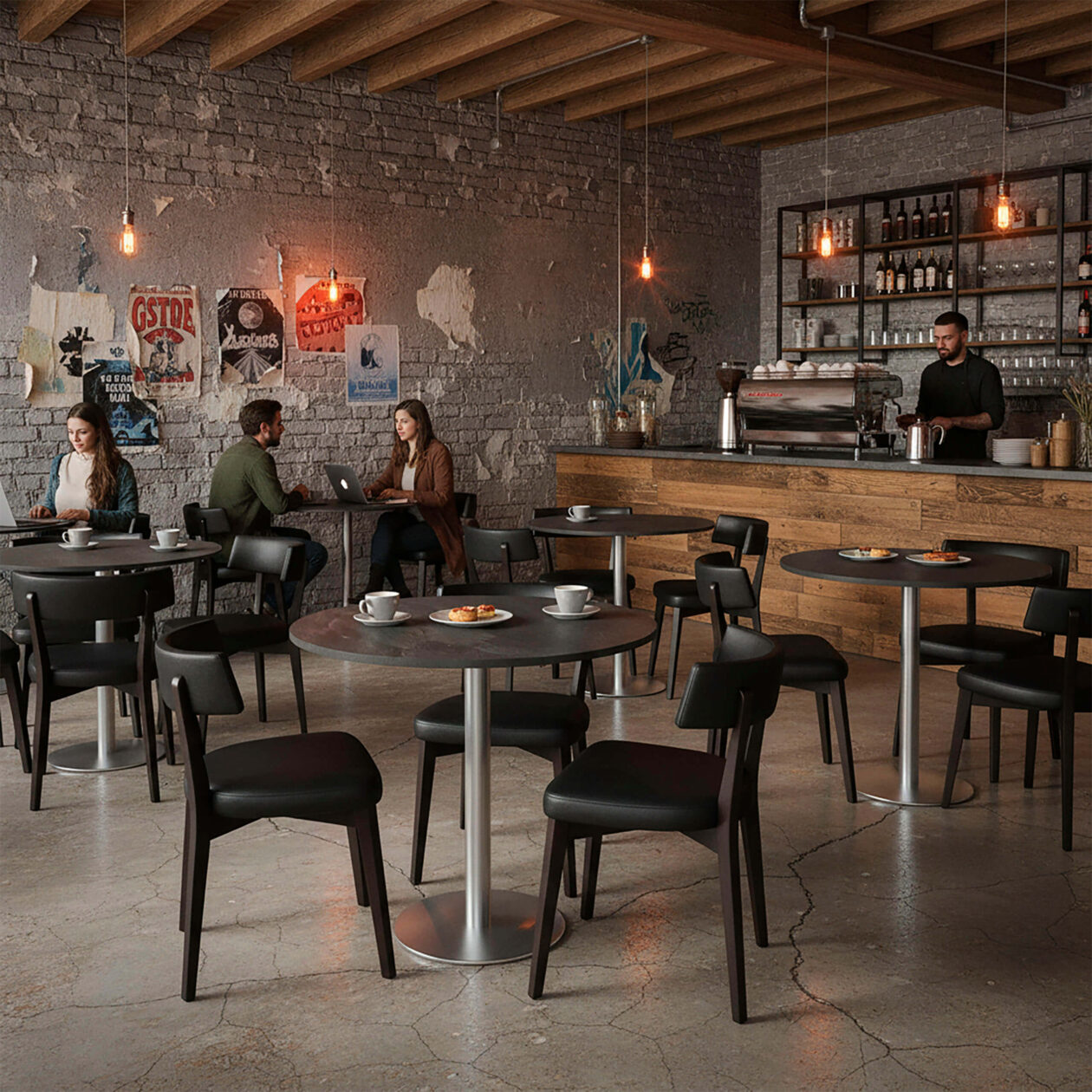 Denne professionelle cafebord pakke er velegnet til caféer, restauranter, hoteller, kantiner og loungeområder, hvor der ønskes et moderne, råt og eksklusivt udtryk. Kombinationen af Slate-look bordplade og bordstel i børstet stål passer perfekt til både minimalistiske, industrielle og nordiske indretningskoncepter.