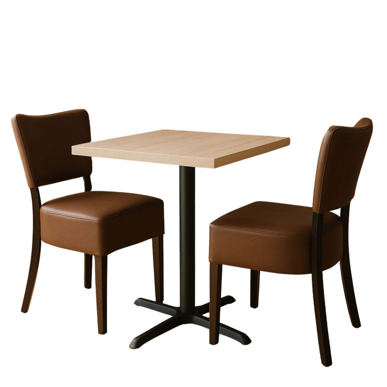 Forside / Møbler / Indendørs Møbler / Cafesæt / Cafesæt 6 – 2 Isabella brune stole – Lys egelook melamin bordplade 70×70 – Gafa 4 sort bordstel